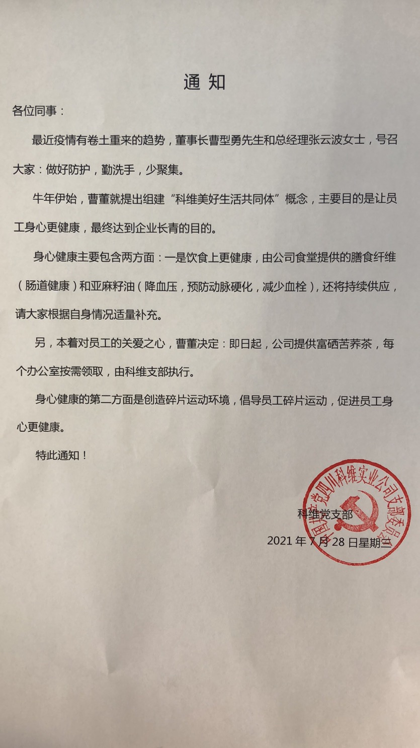 另,本著對員工的關愛之心,曹董決定:即日起,公司提供富硒苦蕎茶,每個辦公室按需領取,由科維支部執行。